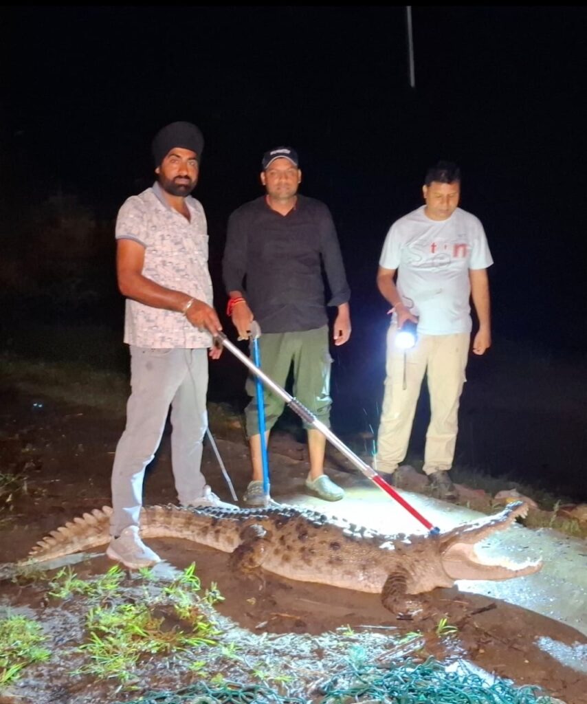विशालकाय मगरमच्छ होने की सूचना वन विभाग को दी गई वन विभाग कर्मचारी गुरजंट सिंह रात्रि लगभग 2 बजे ही टीम के साथ मौके पर पहुंचे । कड़ी मसक्कत के बाद विशालकाय मगरमच्छ का रेस्क्यू किया गया। रेस्क्यू मगरमच्छ को सुरक्षित स्थान पर छोड़ दिया गया । रेस्क्यू के बाद गुरजंट सिंह व उसकी टीम का ग्रामीणों ने दिल से जताया आभार ।