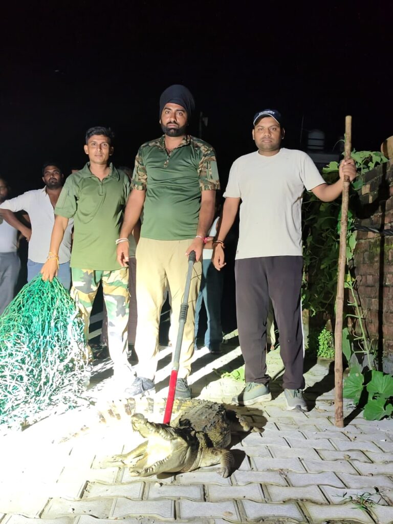 रिपोर्ट रजनीश सैनी — लक्सर के मुंडाखेड़ा कलां गांव में ग्रामीण मदनपाल के घर में रात्रि के समय में एक विशालकाय मगरमच्छ घुस गया । मदनपाल रात्रि में अपने पशुओं को देखने लिये उठे ही थे कि उन्होंने देखा की एक मगरमच्छ उनके घर में आ गया है । तत्काल ही सभी घरवालों को उठाया शोरशराबा सुनकर आसपास के लोग जाग गए । और मगरमच्छ के बारे में वनक्षेत्राधिकारी लक्सर को सूचना देकर मामले से अवगत कराया गया ।मामले की गम्भीरता को देखते हुए वन विभाग द्वारा रेस्क्यू टीम को रात्रि में ही रवाना कर दिया गया वन विभाग टीम मुंडाखेड़ा कलां गांव पहुंची जहां गुरजंट सिंह की अगुवाई में रेस्क्यू अभियान चलाया गया 1 घंटे की मशक्कत के बाद विशालकाय मगरमच्छ का सफल रेस्क्यू किया जा सका मगरमच्छ का सफल रेस्क्यू कर वन विभाग कर्मचारियों द्वारा सुरक्षित स्थान पर छोड़ दिया गया है वन विभाग की तत्परता को देखते हुए ग्रामीणों ने