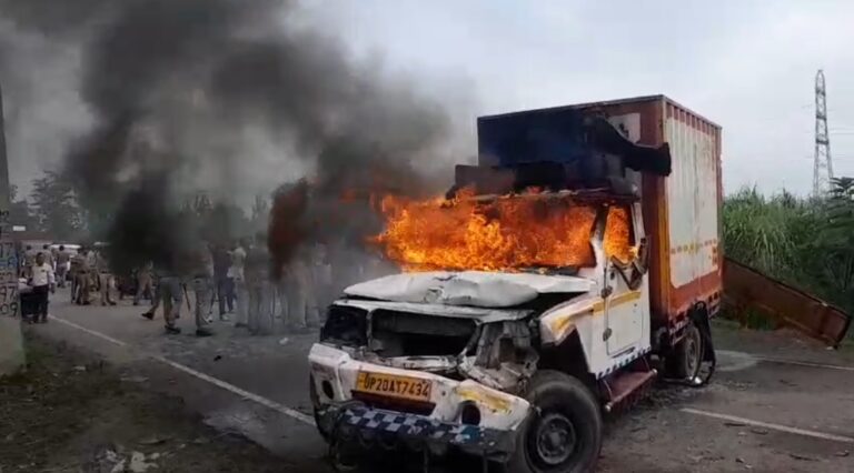 हंगामा कर रहे ग्रामीणों ने मांस से भरी गाड़ी को आग लगा दी, जिसमें सड़क पर अफरा तफरी मच गई,